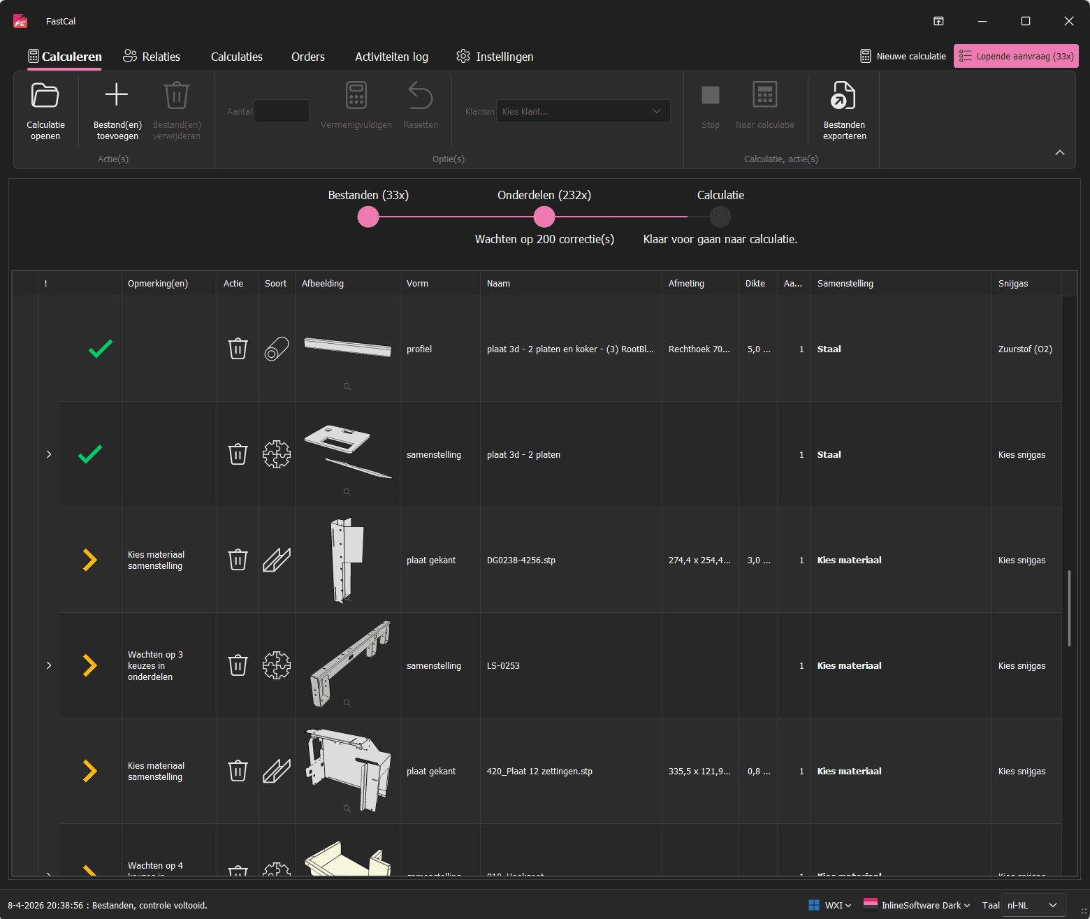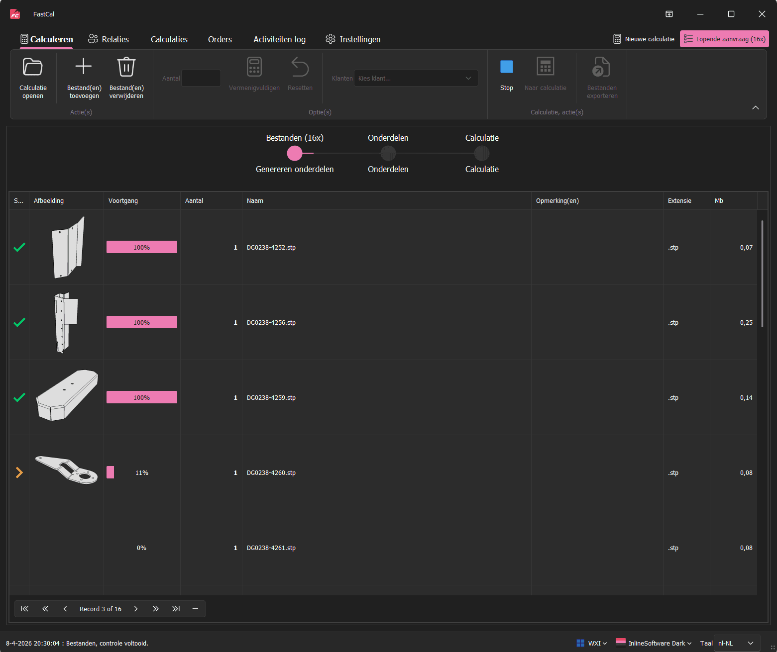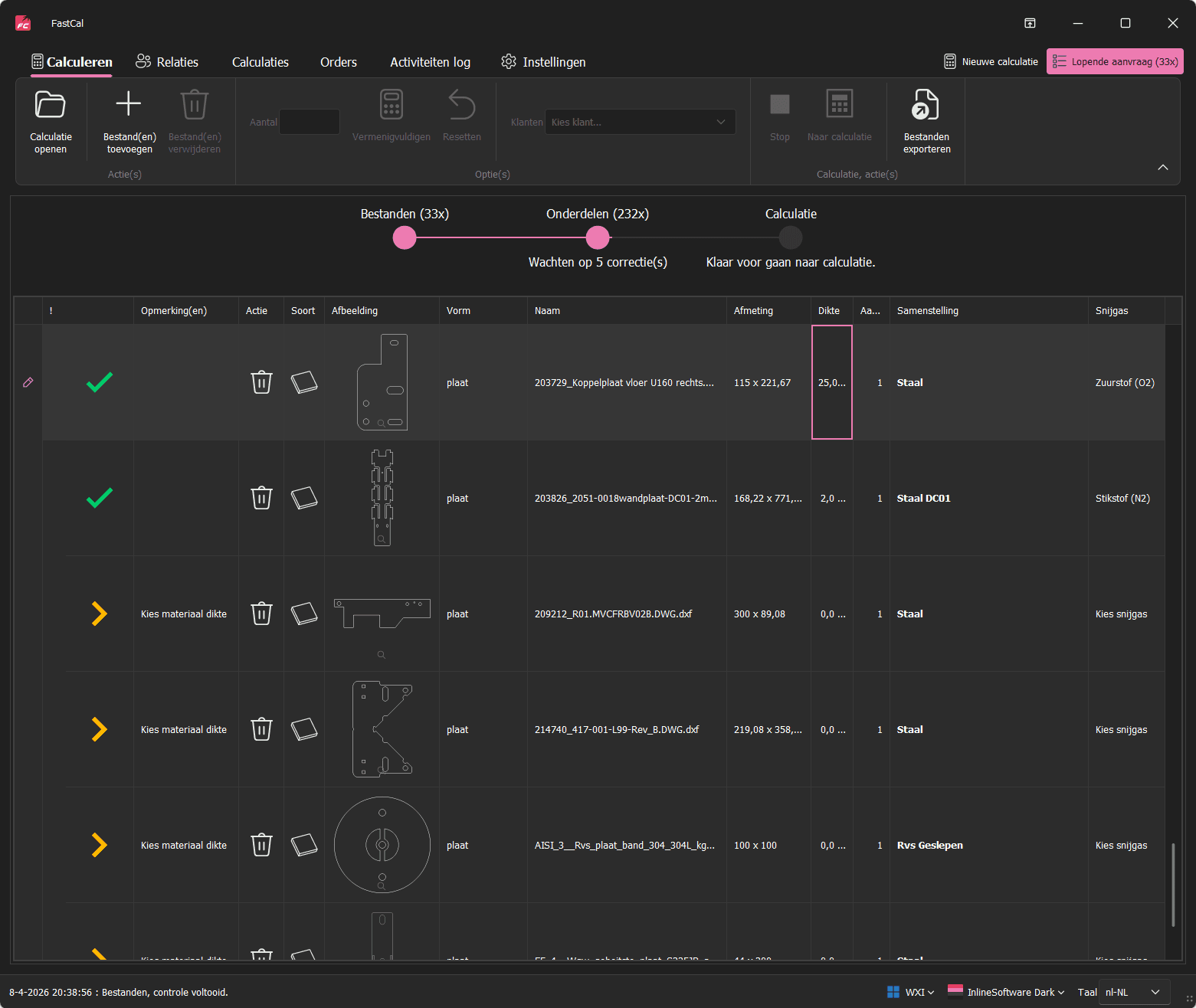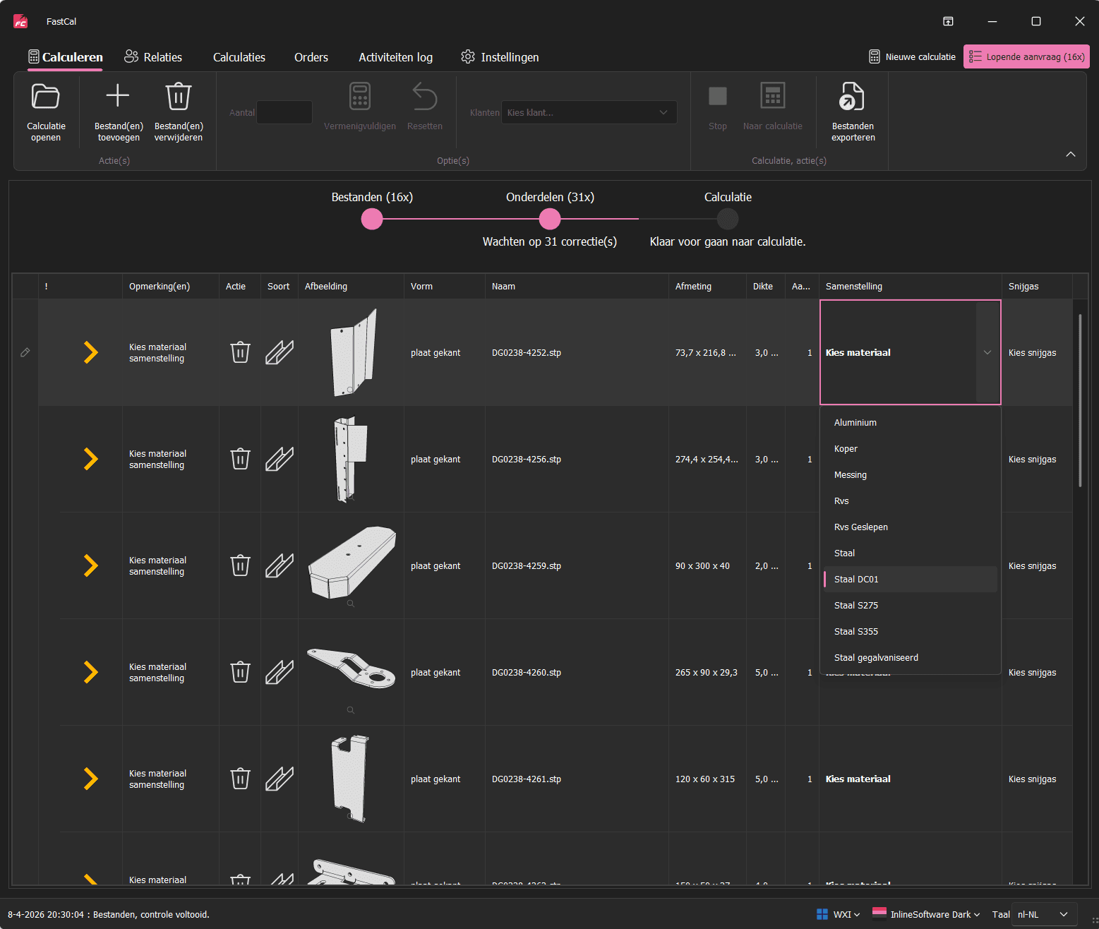 Sleep je STEP, DXF of DWG erin en FastCal rekent direct. Materiaal, dikte, snijlengte, insteken, zettingen en nabewerking. Wat vroeger uren kostte, kost nu seconden. In plaats van níet als eerste een offerte uit te sturen, ga je voor de hoogste conversie.