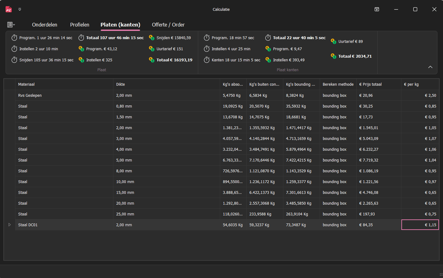 Bereken automatisch het materiaalverbruik, met controle over de rekenmethode. Van absolute kilo's tot bounding-boxmethode. Ook hier met inzicht in productietijden.