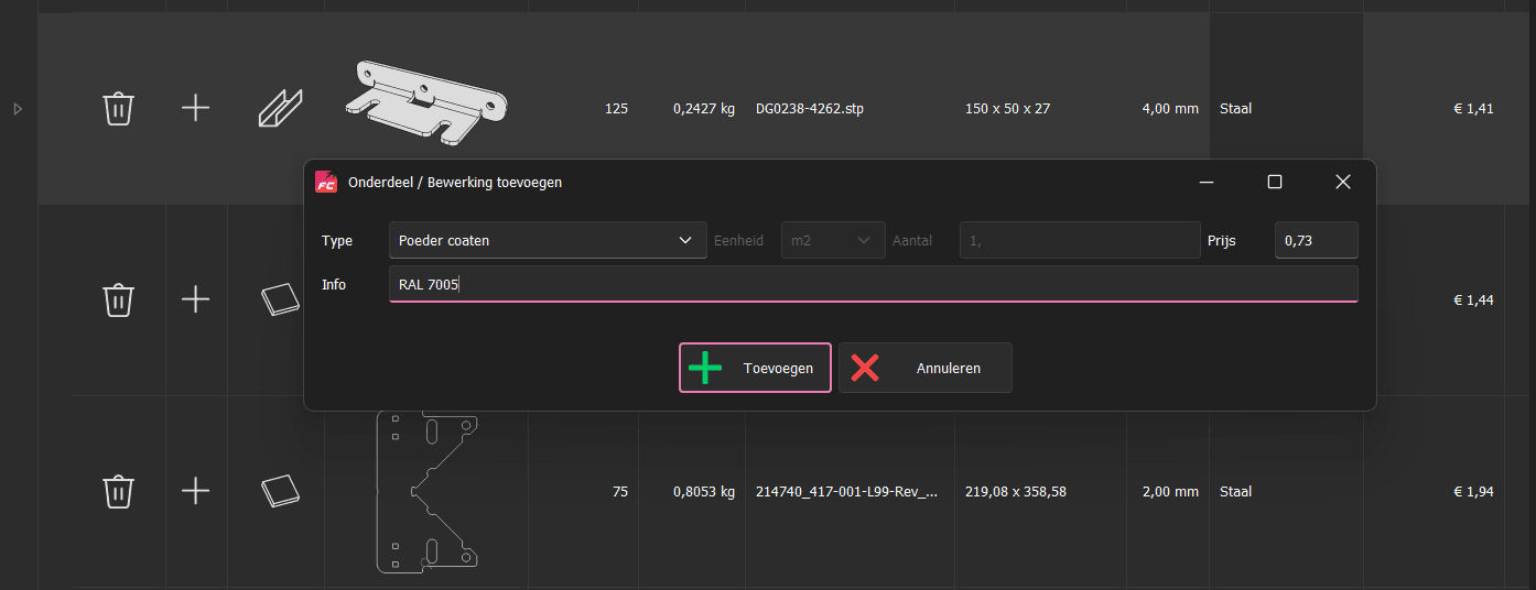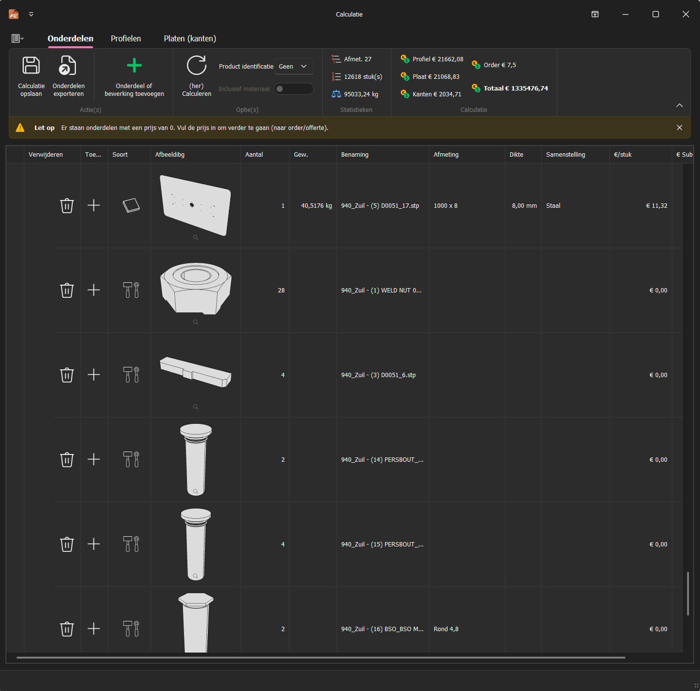Onderdelen die niet onder profiel, plaat of zetwerk vallen, worden tóch meegenomen. Vul zelf de prijs in en het wordt automatisch aan de offerte/order toegevoegd.