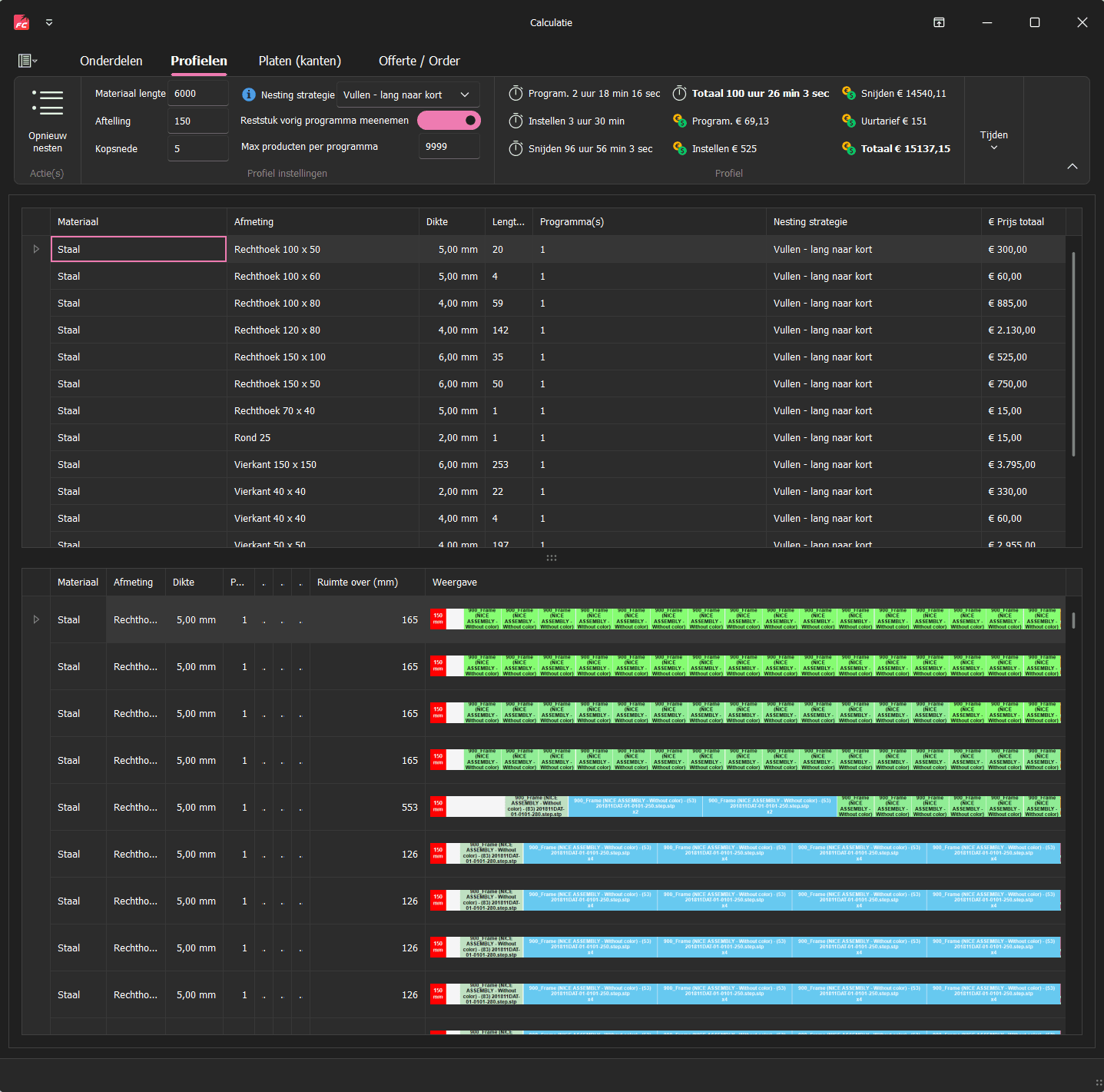 Automatisch nesten van profielen met keuze uit verschillende strategieën. Direct inzicht in productietijd, calculaties en marges. Alles wordt tot in detail meegerekend, zelfs labelen per product heeft impact.