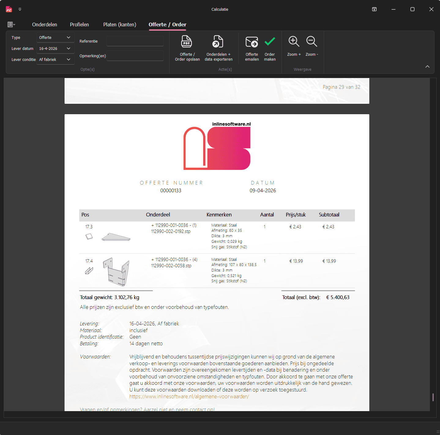 Genereer direct heldere offertes en/of orders, met je eigen voorwaarden. Verstuur de offerte meteen per mail, of maak de order aan voor productie.