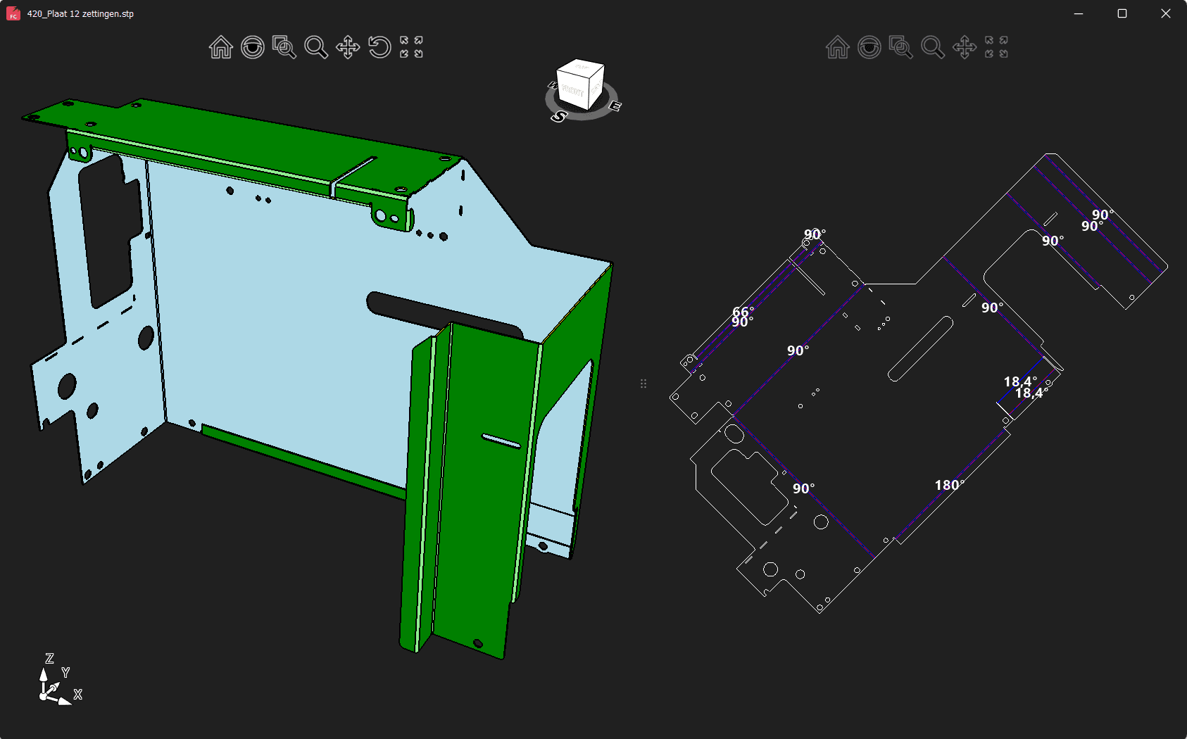 Van 3D naar uitgeslagen 3D-flatpattern, met de zethoeken erbij aangegeven.