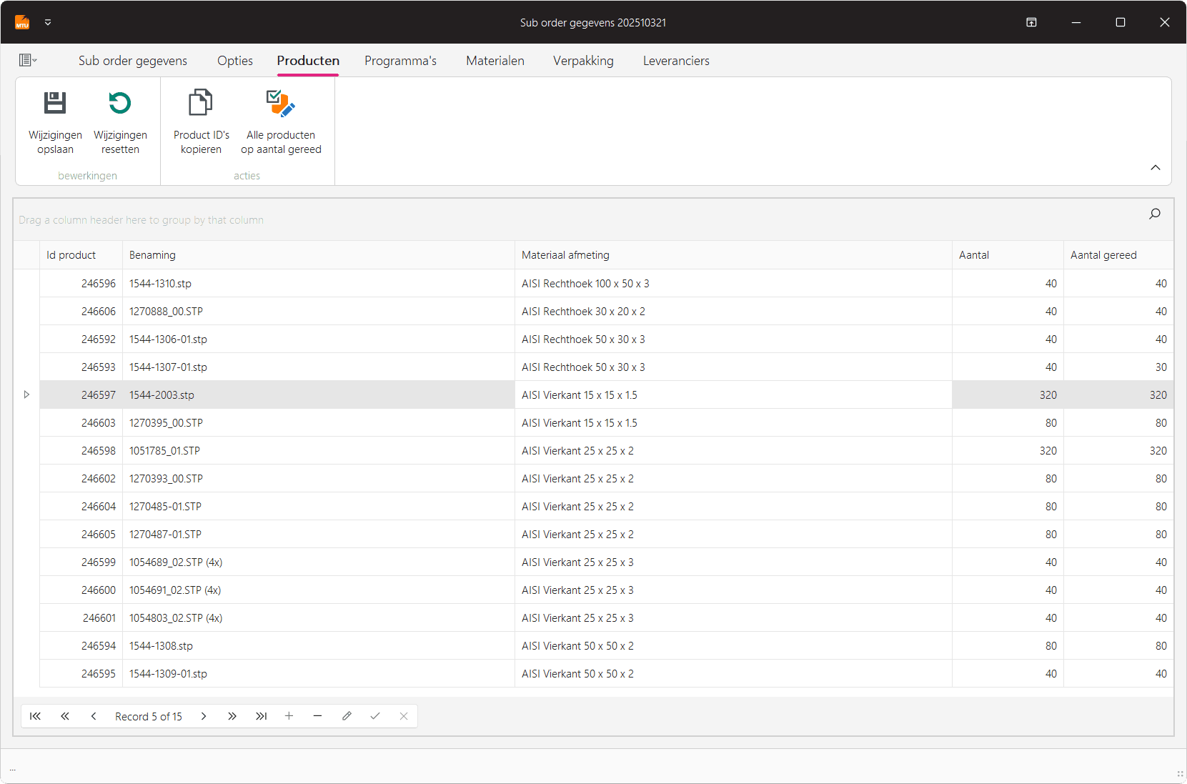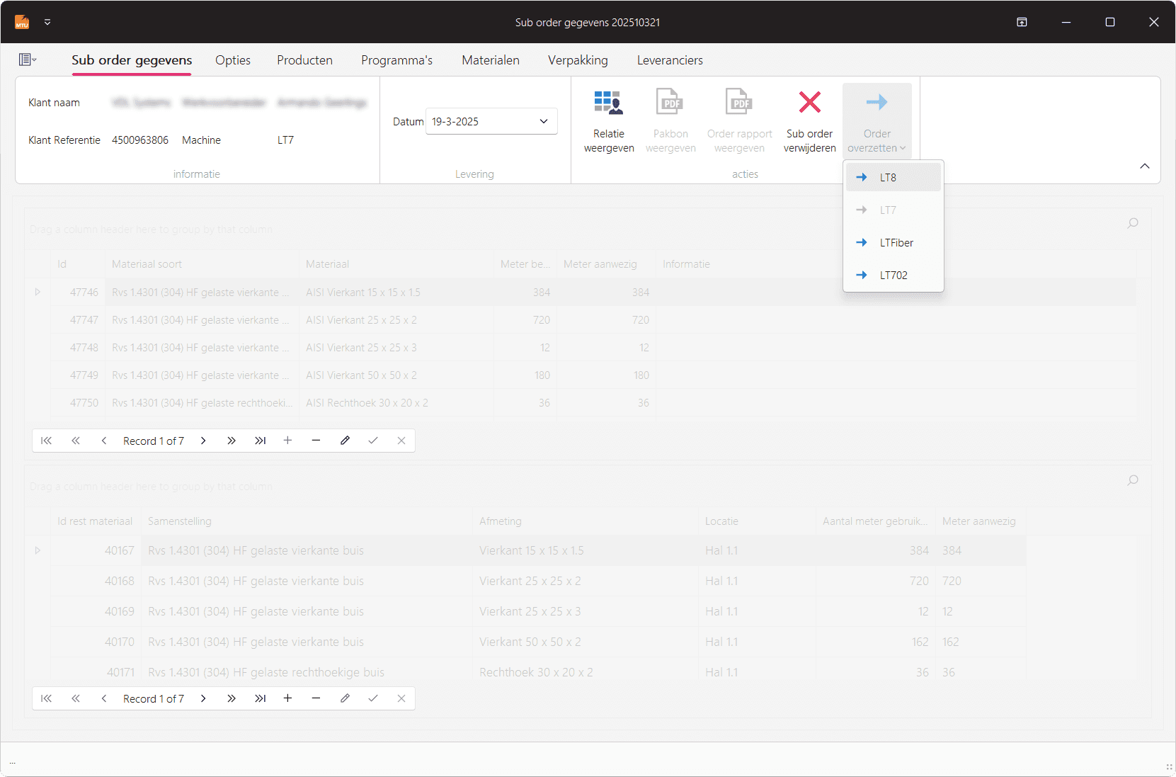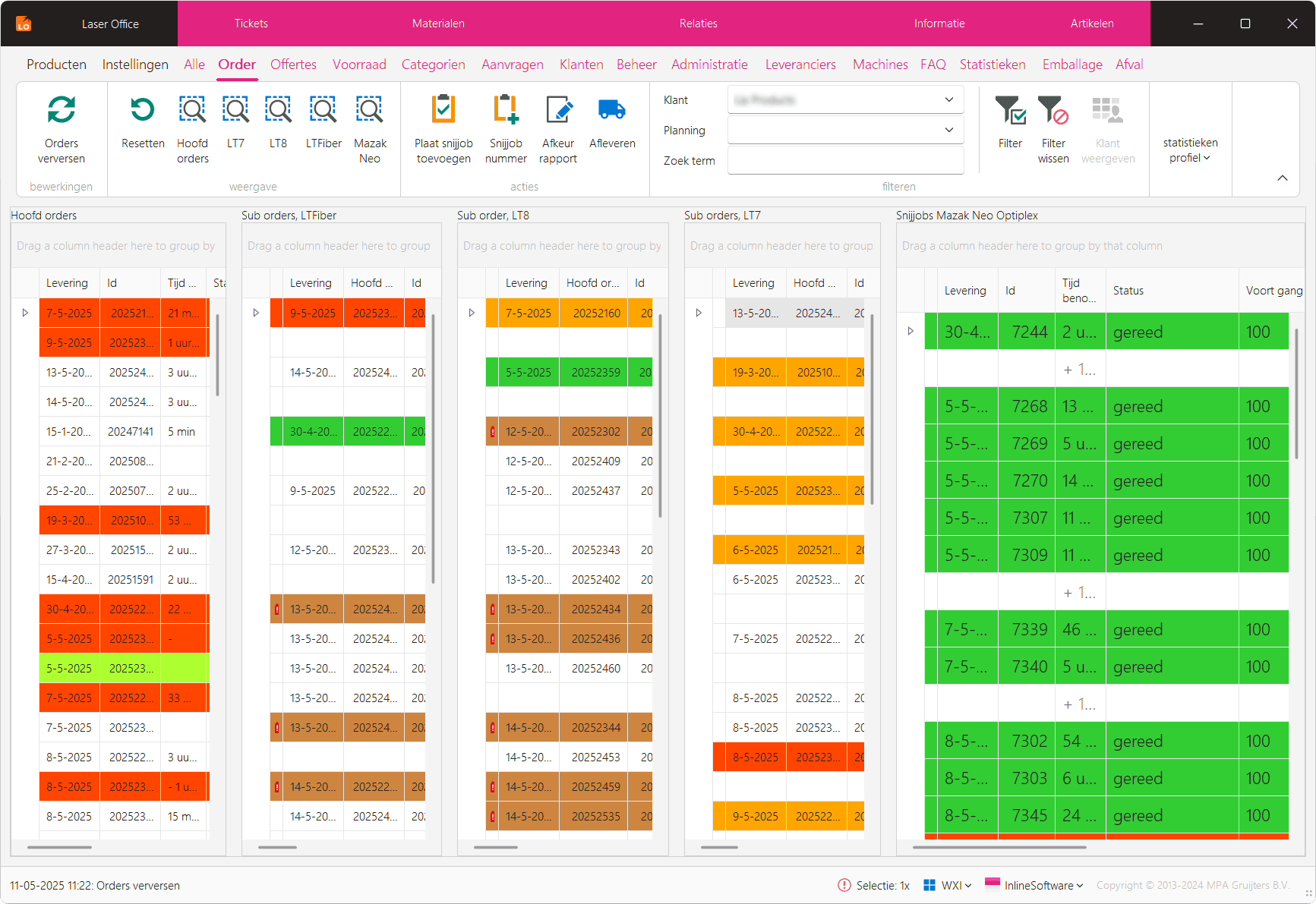 Brengt overzicht en inzicht. Van planning tot materiaal voorraad. Status van de machines en voortgang van de orders, live in 1 overzicht. Foutgevoeligheid tot het minimale, met lage werkdruk. Splits grote orders in overzichtelijke suborders, verdeeld over meerdere machines. Bij levering komen ze automatisch weer samen – alsof ze nooit gesplitst zijn.